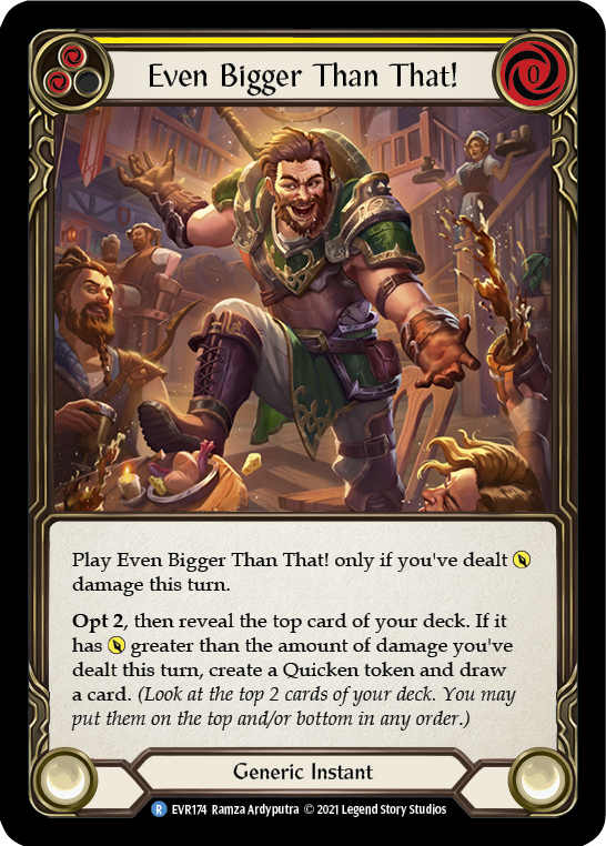 Play Even Bigger Than That! only if you've dealt [Power] this turn. Opt 2, then reveal the top card of your deck. If it has [Power] greater than the amount of damage you've dealt this turn, create a Quicken token and draw a card. (Look at the top 2 cards of your deck. You may put them on the top and/or bottom in any order.)